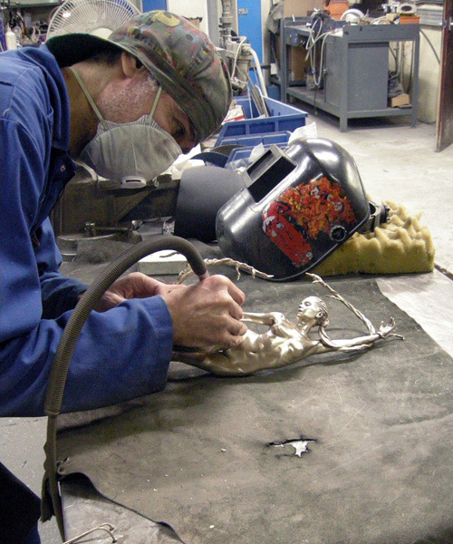 The figure then goes to patination which is the final finish. Using a blow torch the patineur applies a thin coat of coloured chemicals to the metal sculpture with a brush at the same time heating it with a torch to adhere it to the surface.